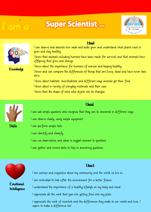 At Silvertrees we take a head, hand heart approach in all subjects to develop the children's knowledge, skills and positive attitudes. These are the head, hand, heart aims we want all children to achieve in science by the end of Year 2...