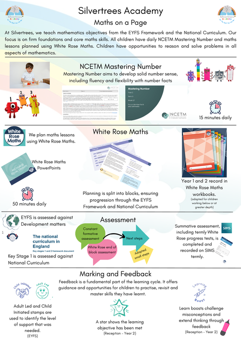 In Reception, maths is taught discretely twice a week within adult-led time following White Rose Maths Overview. Provision (both indoors and outdoors) is enhanced fortnightly with a focus on maths, giving children opportunities to apply what they have learnt in taught sessions.