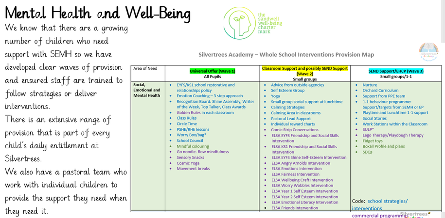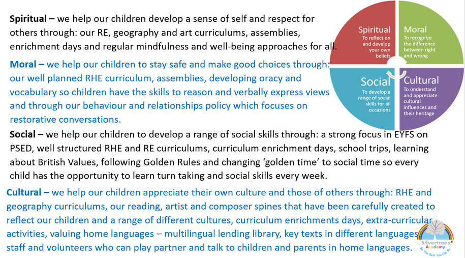 INTENT: Every leader and staff member at Silvertrees Academy is dedicated to shaping young lives now so they can build bright and fulfilling futures. We want every child at Silvertrees to develop a strong sense of identity and self-worth that will give them the confidence and resilience to succeed in an ever changing and demanding world. We will give children the knowledge and skills to be happy and healthy; to keep themselves safe and be physically and mentally healthy. They will develop the skills to form healthy relationships in our modern world. Our children will know how to make the right choices but will also be aware of their rights and have the confidence to say no! As an infant school we want our children to see the awe and wonder of the world around them; to be excited, to explore and be part of a wider community. To understand the richness of our diverse community and embrace and celebrate differences. In short, at Silvertrees we are committed to shaping resilient and responsible young people who have positive lives and a positive effect on the lives of others.